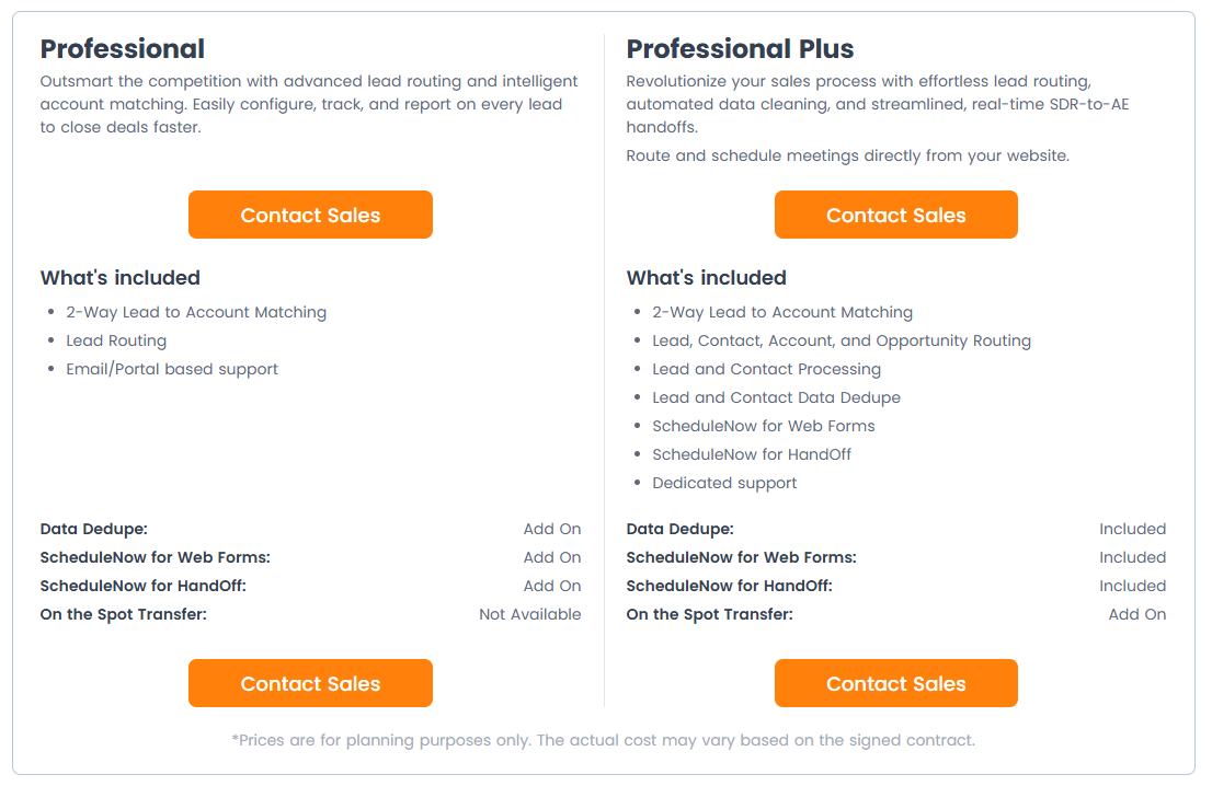 - Professional Plan – This plan is great for small to mid-sized teams. It provides features like lead routing, 2-way lead-to-account matching, and email/portal-based support. Add-ons, such as data deduplication and Schedule Now for web forms and handoff, are available.