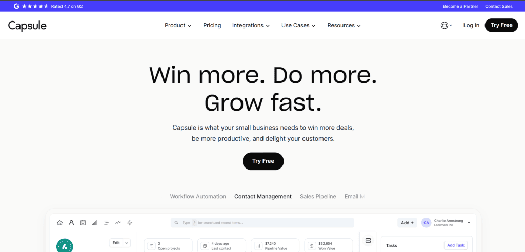 What makes Capsule CRM stand out is its clean and minimal design. Unlike some CRMs that come with too many features, Capsule keeps things simple. It also integrates with Google Workspace, Microsoft 365, and Xero, making it easy to sync contacts, emails, and financial data.