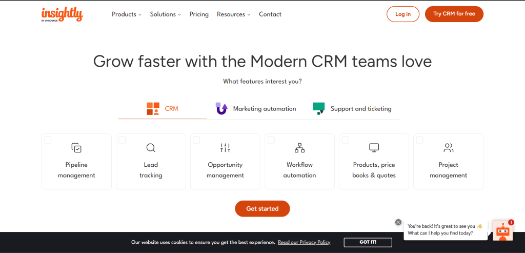 One of Insightly’s unique features is its project management tool, which allows teams to track tasks and deadlines within the CRM. This is useful for businesses that need both lead tracking and post-sale project management. The Kanban-style pipeline view also makes it easy to see where each deal stands at a glance.