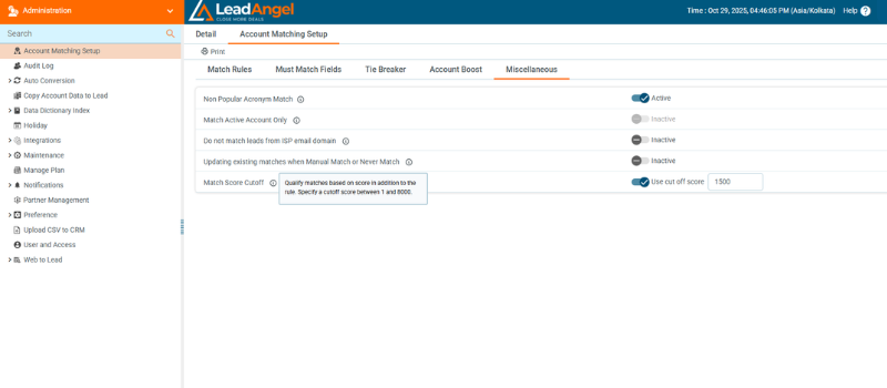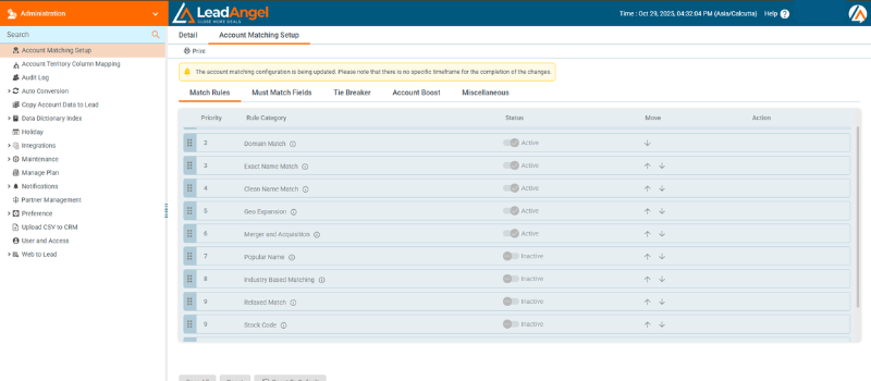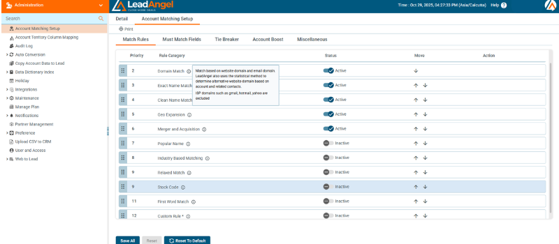 Each match is scored by confidence level. Once a match meets defined criteria, LeadAngel temporarily freezes the record to prevent duplicate routing or merging. The record remains locked until the lead router completes processing, after which it unfreezes automatically to allow updates or new actions.