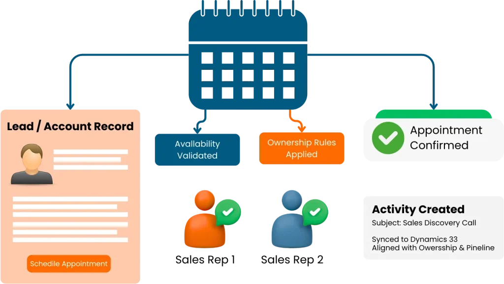 LeadAngel integrates calendar scheduling into Microsoft Dynamics lead and account workflows. Meetings are created as Dynamics activities, with availability validated in real time and scheduling data aligned with ownership and pipeline processes.