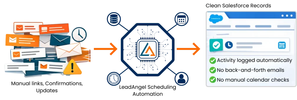 Salesforce scheduler often leaves teams managing links, confirmations, and updates manually. LeadAngel handles meeting links, confirmations, reschedules, and updates directly inside Salesforce workflows. All activity is logged automatically on Salesforce records, eliminating back-and-forth emails and manual calendar checks.