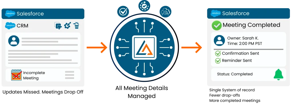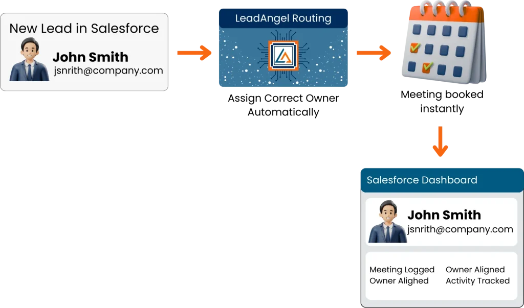 The system checks for conflicts, validates time slots, and applies your lead-assignment logic to determine which rep should receive the meeting, supporting Salesforce meeting scheduling and automated routing.