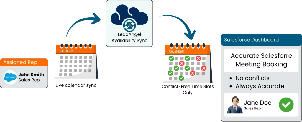 Built-in scheduling tools can rely on static or delayed calendar data, leading to conflicts and reschedules. LeadAngel syncs with each assigned rep’s connected calendar to reflect real-time availability during scheduling. Only valid, conflict-free time slots are shown, ensuring meetings booked through Salesforce do not overlap with existing commitments and remain accurate as calendars change.