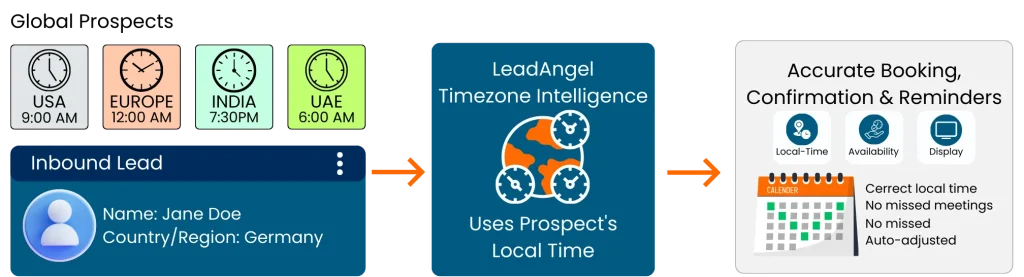 Salesforce’s in-built scheduling isn’t designed for global inbound teams managing multiple regions. LeadAngel applies timezone intelligence at the moment of scheduling, using the prospect’s local time, not the sender’s. Availability, confirmations, and reminders are delivered at the correct local time for each prospect, with automatic adjustments if a scheduled time has already passed, ensuring accurate delivery, fewer misses, and a seamless scheduling experience.