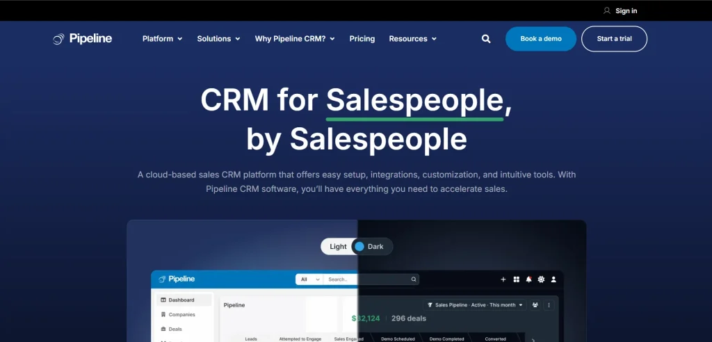 Pipeline CRMStraightforward pipeline sales software for tracking dealsLead tracking, forecasting, pipelines, activity tracking$29–$59/user/monthTeams wanting simple pipeline tracking
