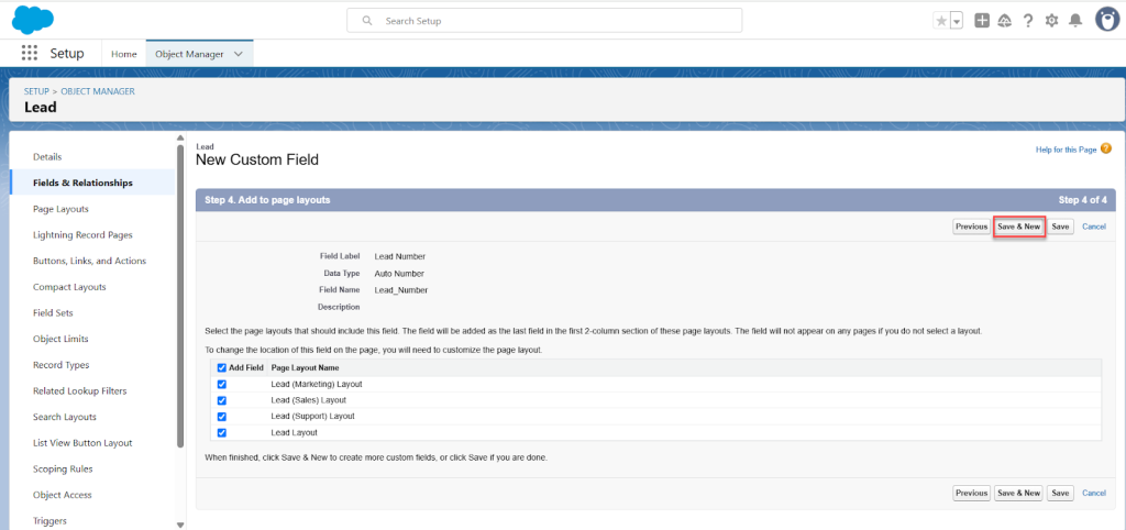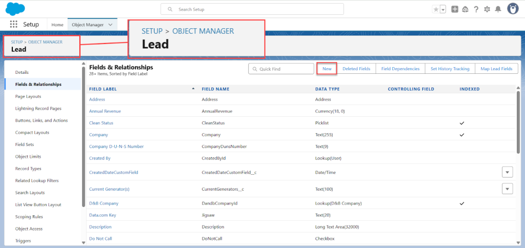 • Still in the Lead object, click Fields & Relationships > New.