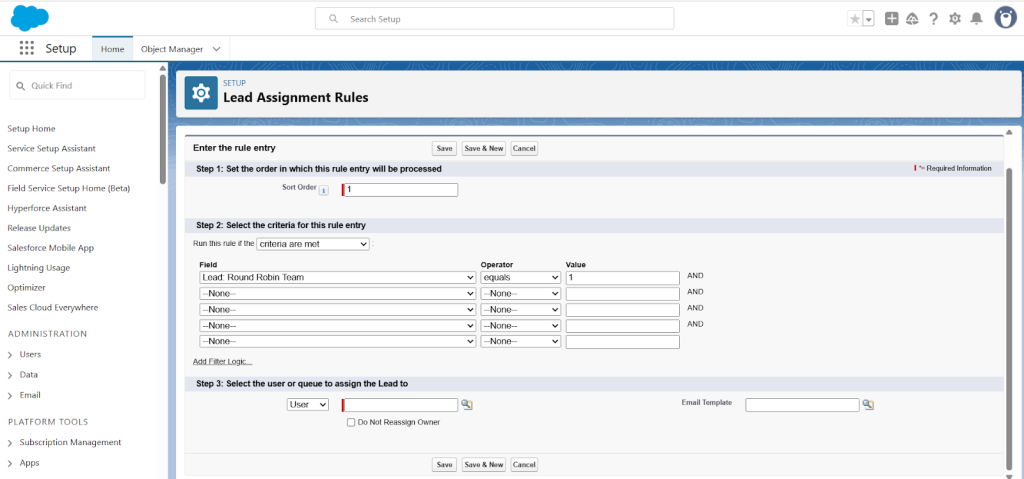 Salesforce doesn’t offer a built-in Round Robin feature, but you can create a working system using custom fields and Lead Assignment Rules. The process takes a little setup, but once it’s in place, new leads can be automatically routed across your sales team in a rotating pattern.